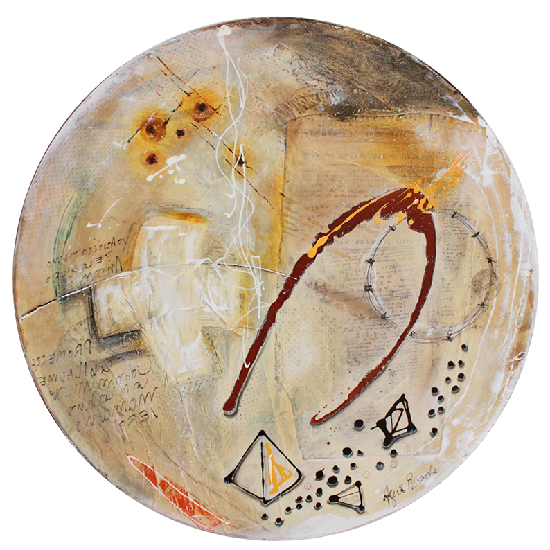La priorité donnée au langage, orchestre parfois un mélange d’idiomes et de mots diverses à la surface des tableaux ou encore dans les commentaires qui les entourent. L’œuvre d’art se trouve alors entourée d’un cocon de poésie, de proverbes et d’aphorismes, tandis que ces derniers vont et viennent entre le tableau et son entourage. On y observe une pratique picturale entre relief et impalpable, par laquelle la raison cartésienne s’effondre, tandis que la notion de rencontre et d’union s’affirme dans le champ de l’invisible. Quelque chose se cache dans une autre strate de la réalité, celle-là même qui n’est pas immédiatement perceptible, mais affleure à la surface des tableaux. L’acte de création devient une fonction naturelle consistant à reconnaître une autre dimension de nous-même. Chaque œuvre témoigne d’une soif de connaissance, mais d’une connaissance qui passe par des chemins détournés, par une spiritualité douce et limpide. Celle-ci implique de se dépouiller du rationnel et d’accepter de se laisser porter, autrement dit de se livrer en toute légèreté à un lâcher-prise essentiel.
